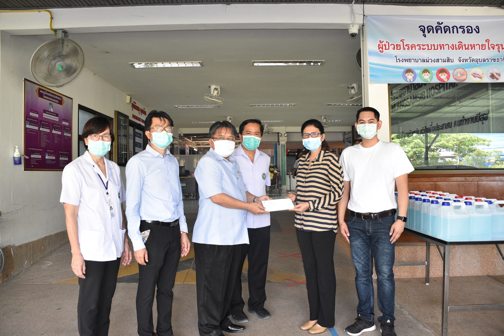 นายแพทย์ประจักษ์ สีลาชาติ ผู้อำนวยการโรงพยาบาลม่วงสามสิบ ในนามประธานเครือข่ายบริการสุขภาพอำเภอม่วงสามสิบ พร้อมด้วย ท่านสมัย พูลทอง สาธารณสุขอำเภอม่วงสามสิบ พร้อมคณะเจ้าหน้าที่ตัวแทน รพ.สต.ทั้ง 24 แห่ง รับมอบ แอลกอฮอล์ จำนวน 27 แกลลอน